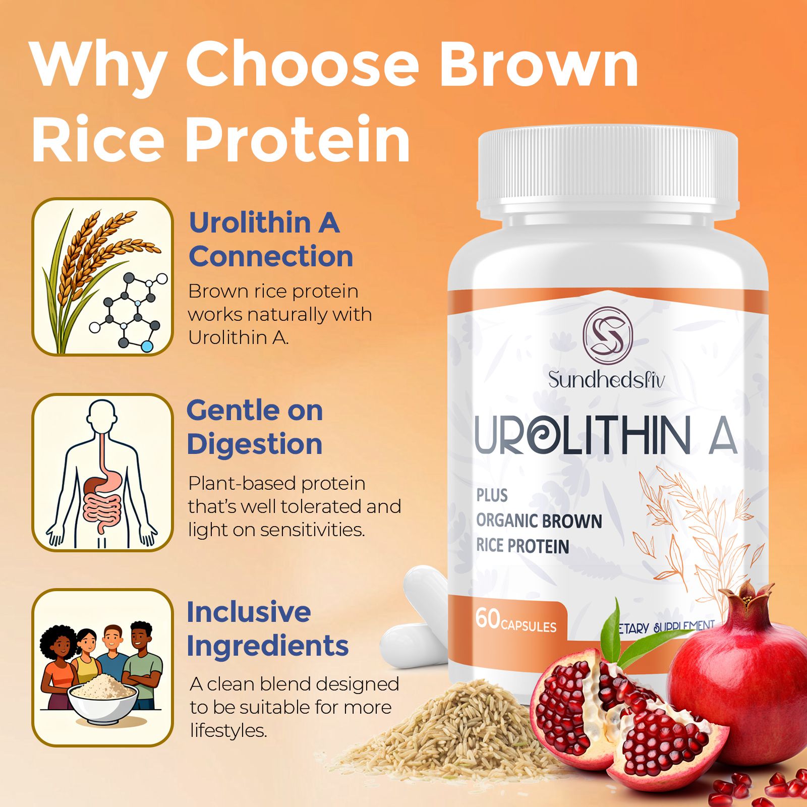 Supports Exercise Performance & Active Lifestyles: Sundhedsliv Urolithin A combines Urolithin A with brown rice protein, two ingredients commonly used by individuals with active routines. This powerful blend is crafted to help improve stamina, muscle performance, and post-exercise recovery—perfect for athletes, fitness enthusiasts, and anyone pursuing a healthier, more active lifestyle.